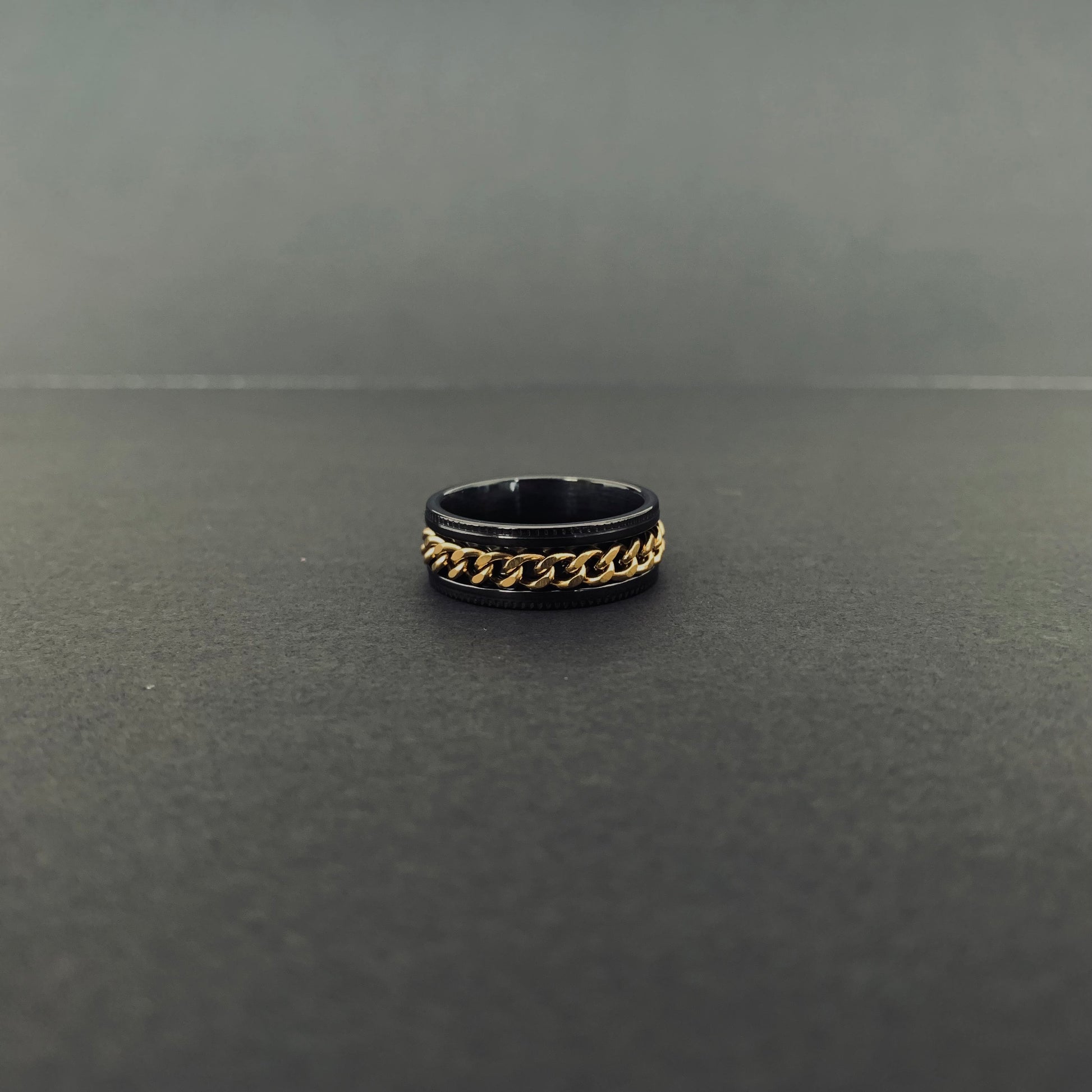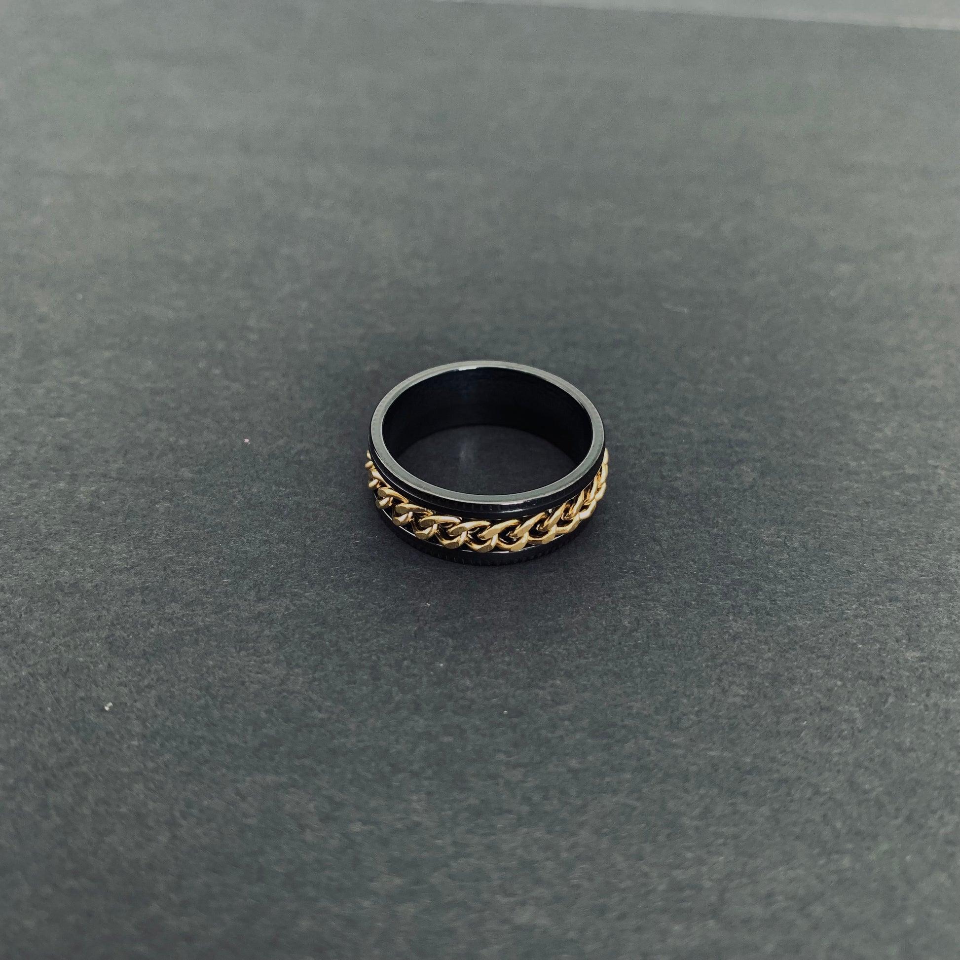 Sleek gold chain ring crafted from black stainless steel. This size 10 statement piece combines contrasting metals for an edgy, modern look. Durable construction withstands daily wear while maintaining its bold aesthetic. Perfect for guys who want understated sophistication with an edge.