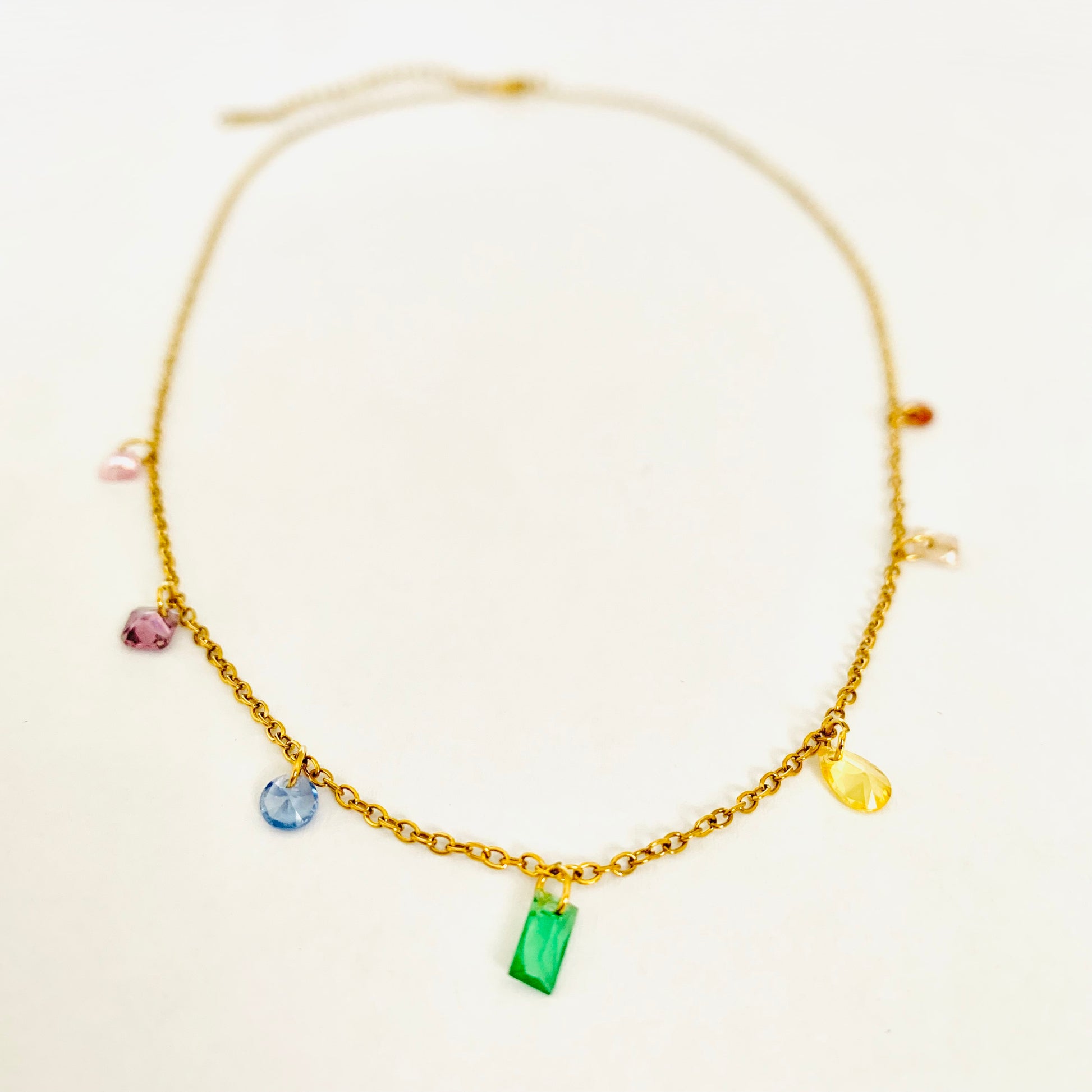 Elevate your everyday style with this stunning multi-colored gemstone charmed necklace. Delicate gemstone charms in vibrant hues dangle gracefully from a lustrous gold chain, creating an eye-catching piece that works beautifully layered or worn solo. Perfect for adding a pop of color and personality to any outfit.