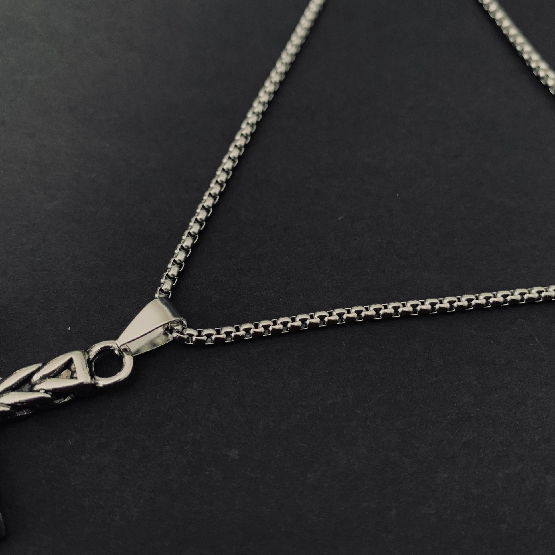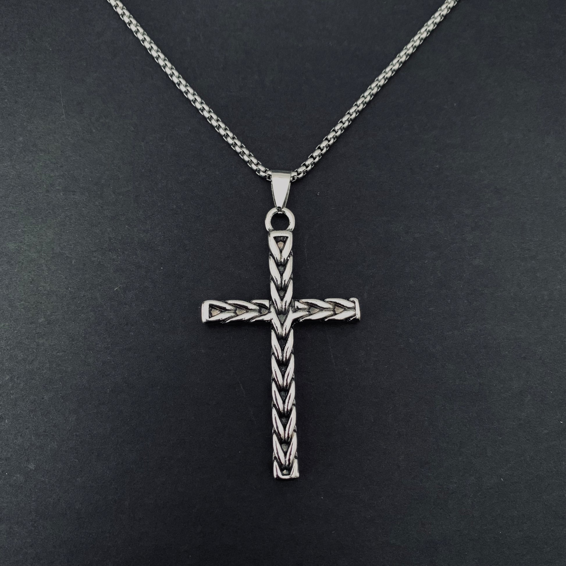 Sleek stainless steel cross pendant featuring a striking silver line pattern. Built tough for everyday wear with a modern edge. Clean design that works solo or layered. Durable construction that won't tarnish or fade.